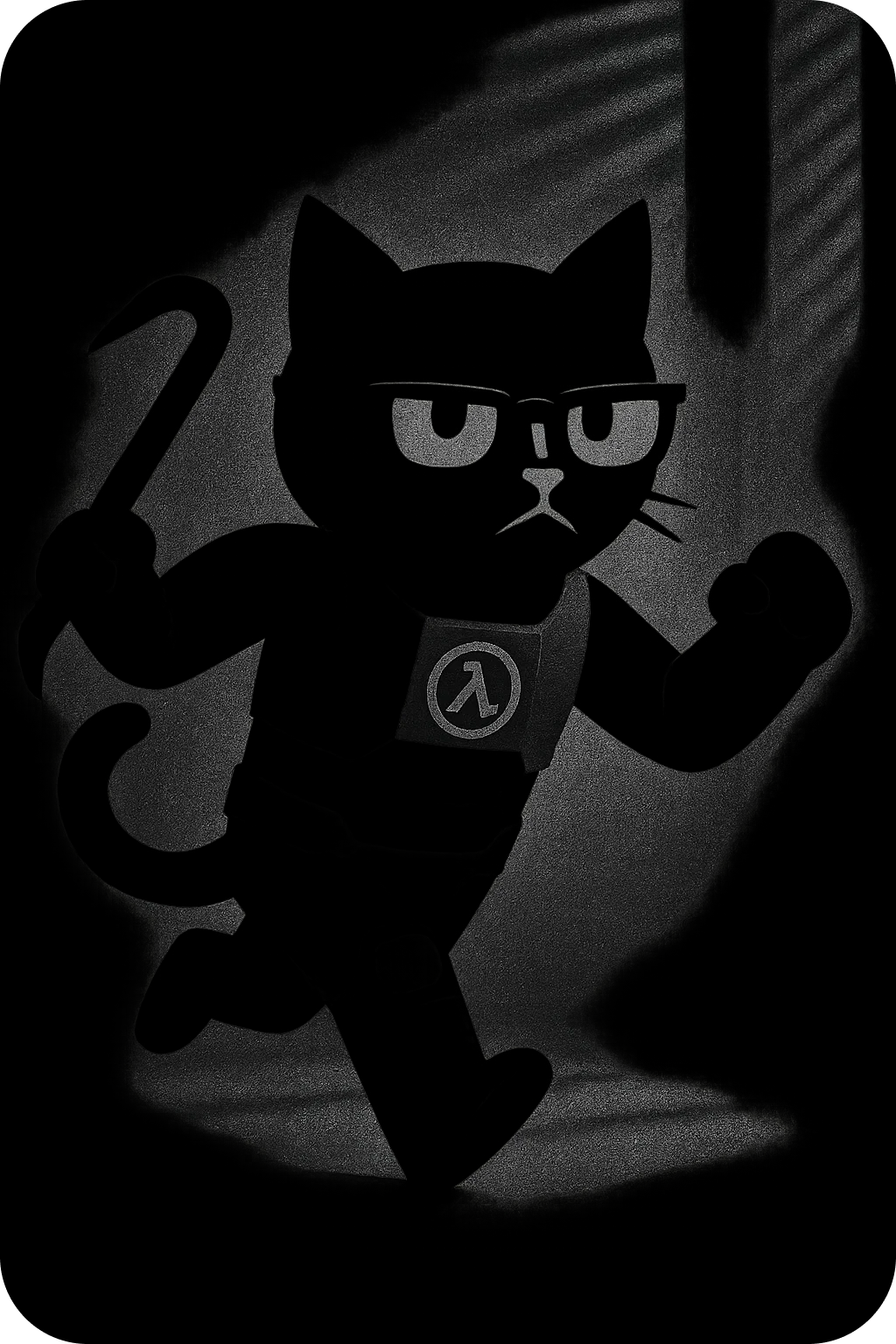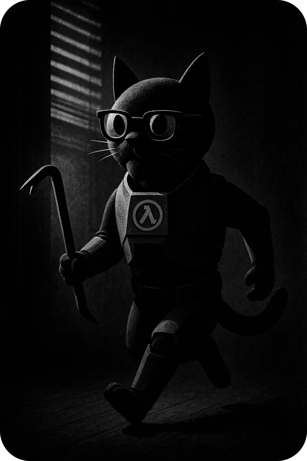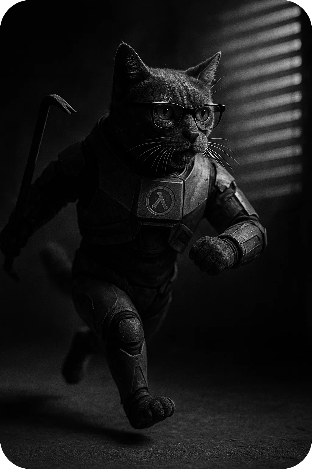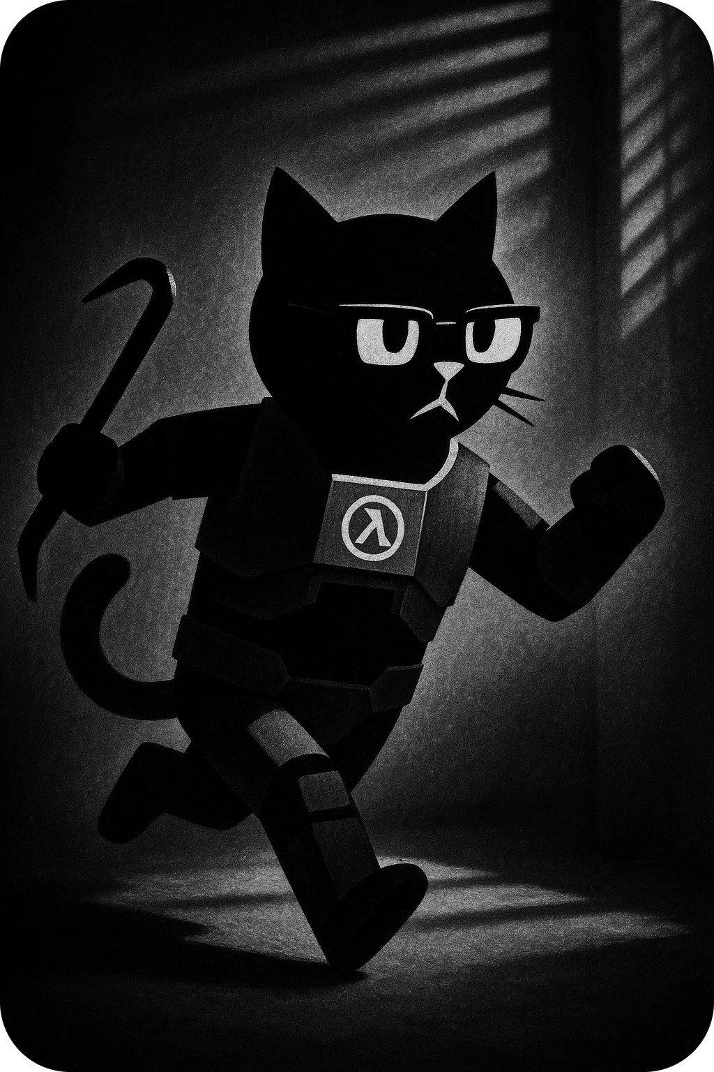 И более стабильный промпт для генерации данного персонажа: "Anthropomorphic black cat in a HEV suit inspired by Half-Life, with glasses and a serious expression. The cat runs on two legs, holding a red crowbar in one paw. The suit has armor plates and a lambda (λ) symbol on the chest. Tail lifted and slightly curled. Scene style: noir, dramatic lighting with shadows from window blinds, cinematic atmosphere."