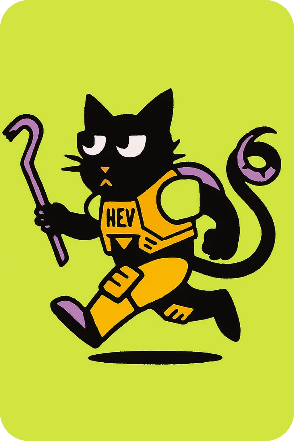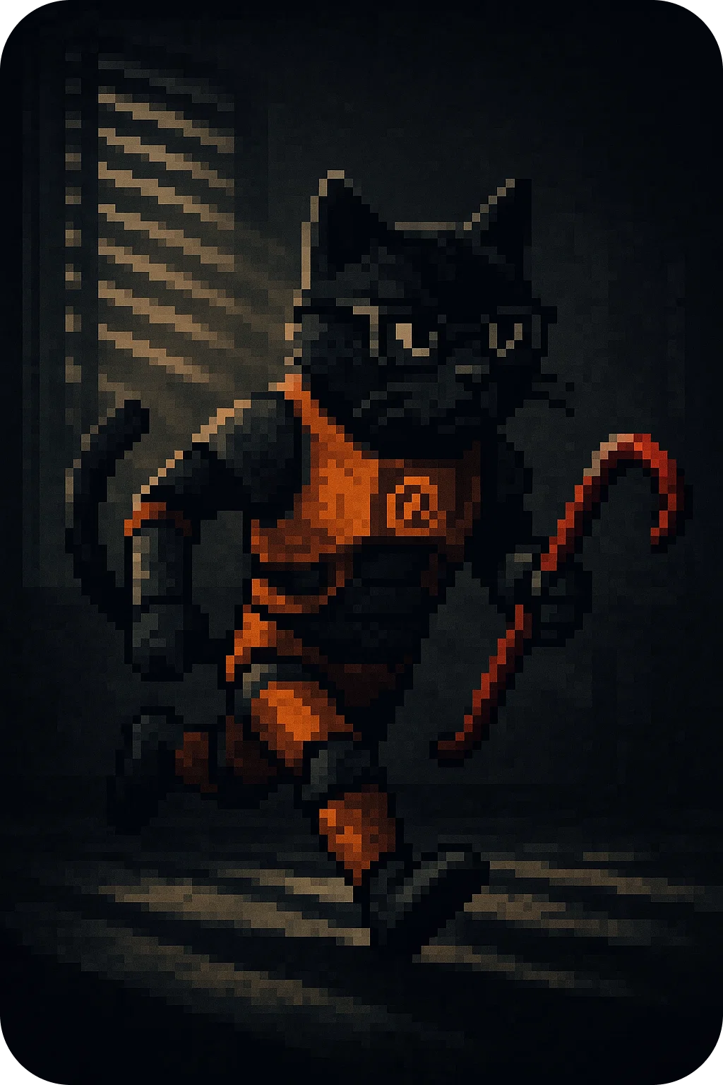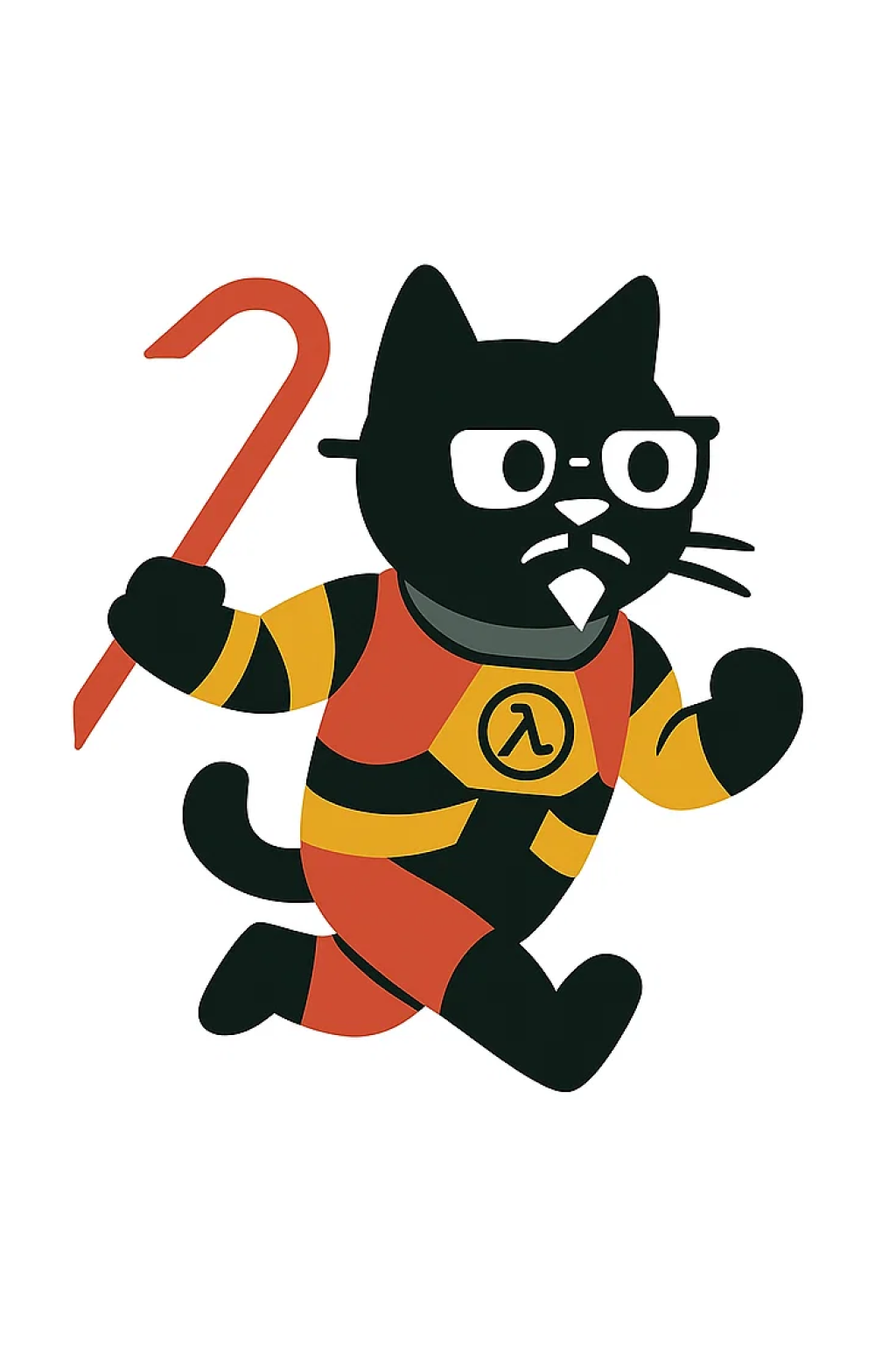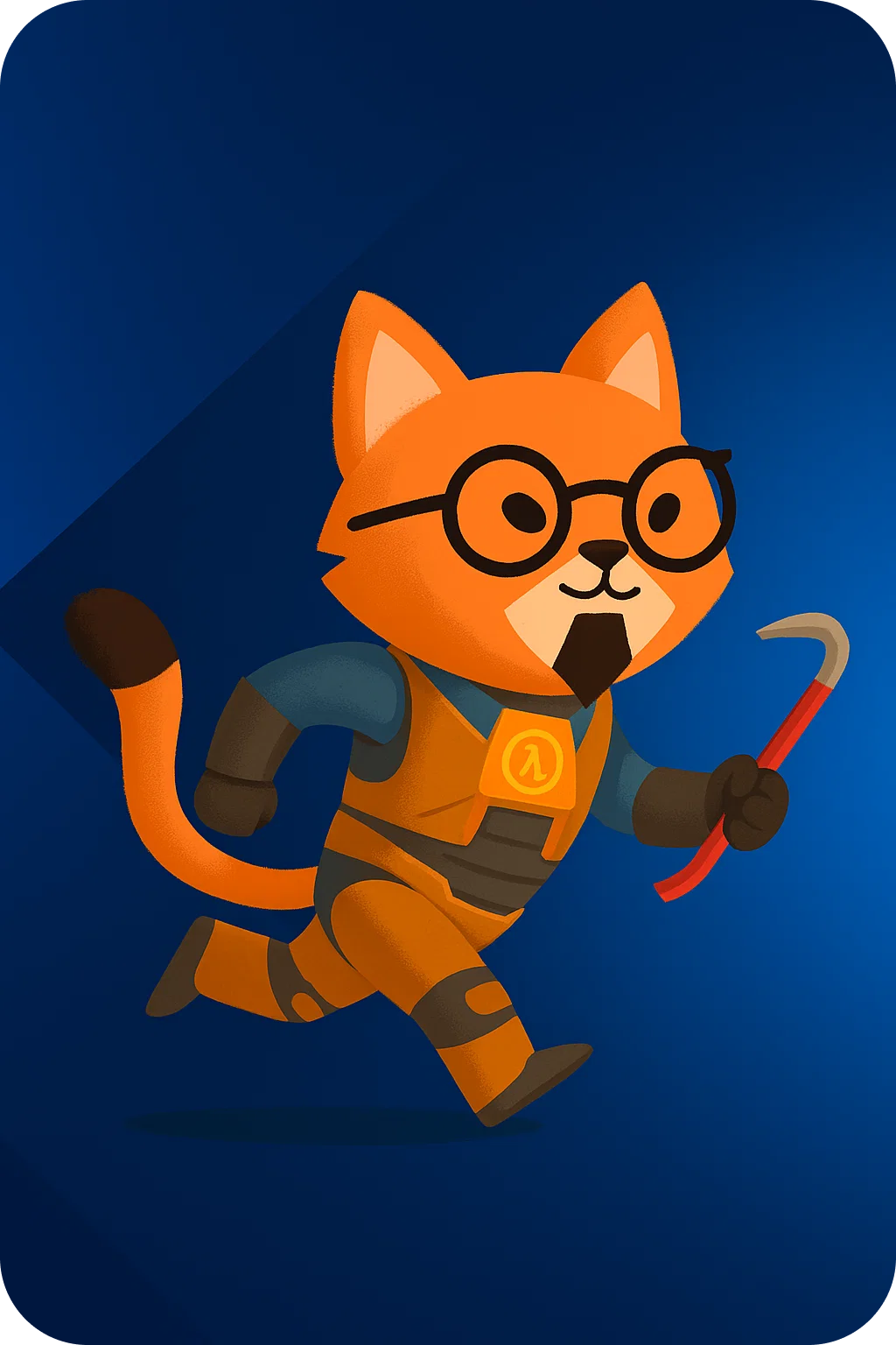 И более стабильный промпт для генерации данного персонажа: "Anthropomorphic black cat in a HEV suit inspired by Half-Life, with glasses and a serious expression. The cat runs on two legs, holding a red crowbar in one paw. The suit has armor plates and a lambda (λ) symbol on the chest. Tail lifted and slightly curled. Scene style: noir, dramatic lighting with shadows from window blinds, cinematic atmosphere."